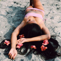 The image shows a woman lying on her back on the sand, possibly at the beach. She is wearing a bikini and appears to be relaxing or sunbathing. Her hair seems to have salt in it, suggesting she may have been in the water. There are