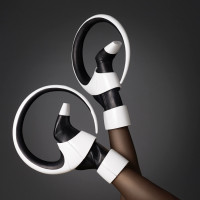 unique design: they have large, circular heels that extend outward from the bottom of each shoe. Additionally, there appears to be some