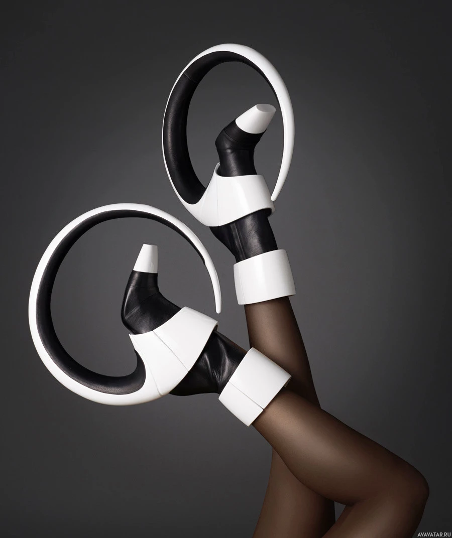 kind of structure or platform attached to the backs of the shoes, suggesting they might be worn with stockings or leggings underneath. The person's legs are crossed at the ankles, and their feet are pointed downwards slightly, displaying the distinctive design elements of these shoes.