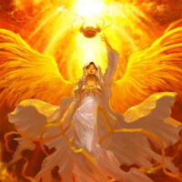 The image features a fantasy-themed depiction of an angel. This angel has large,