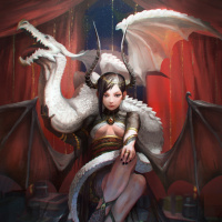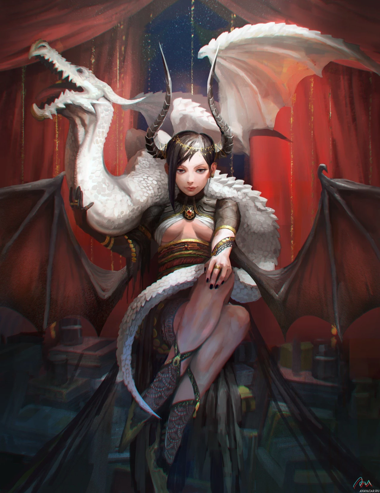 fantasy art image, there is a female figure prominently featured. She has horns and wings that resemble those of a dragon or
