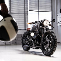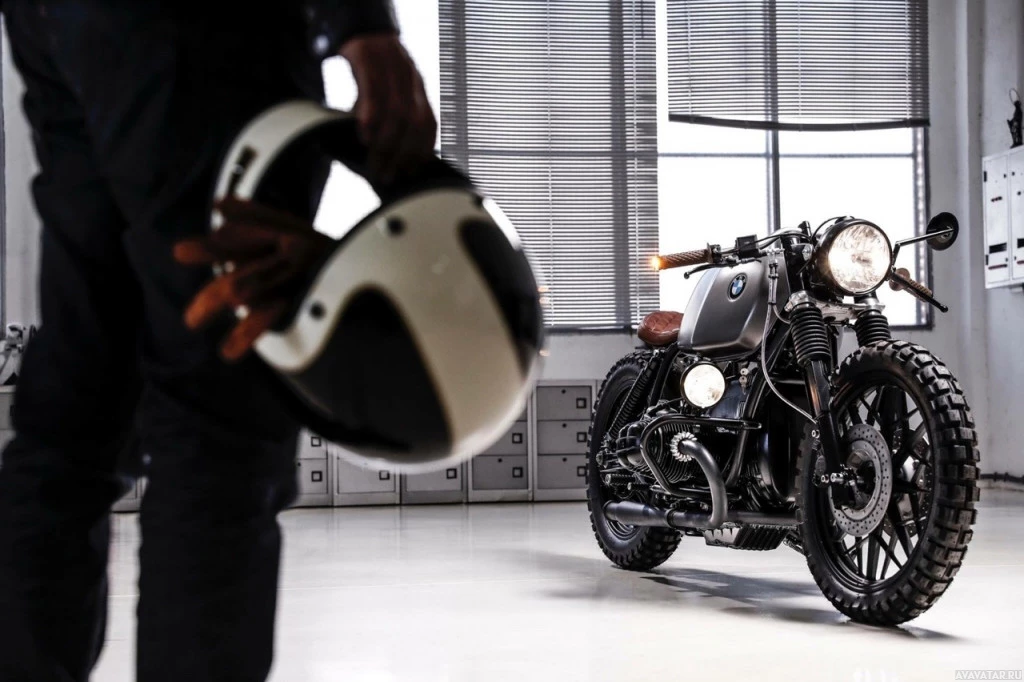 different scenes. On the left, there's a person wearing a helmet and holding it in their hands, suggesting they are either preparing for or have just completed a ride on a motorcycle. The helmet appears to be made by BMW, indicating the brand is associated with this image. On the right side of the image is a vintage-style motorcycle parked indoors, likely in a garage or