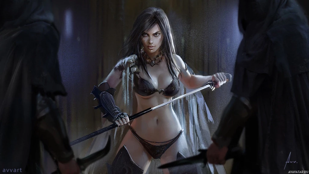 a female character with brunette hair, wearing armor and holding a sword. She is standing confidently in front of two figures who appear to be robed, possibly as villains or antagonists given their attire and