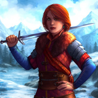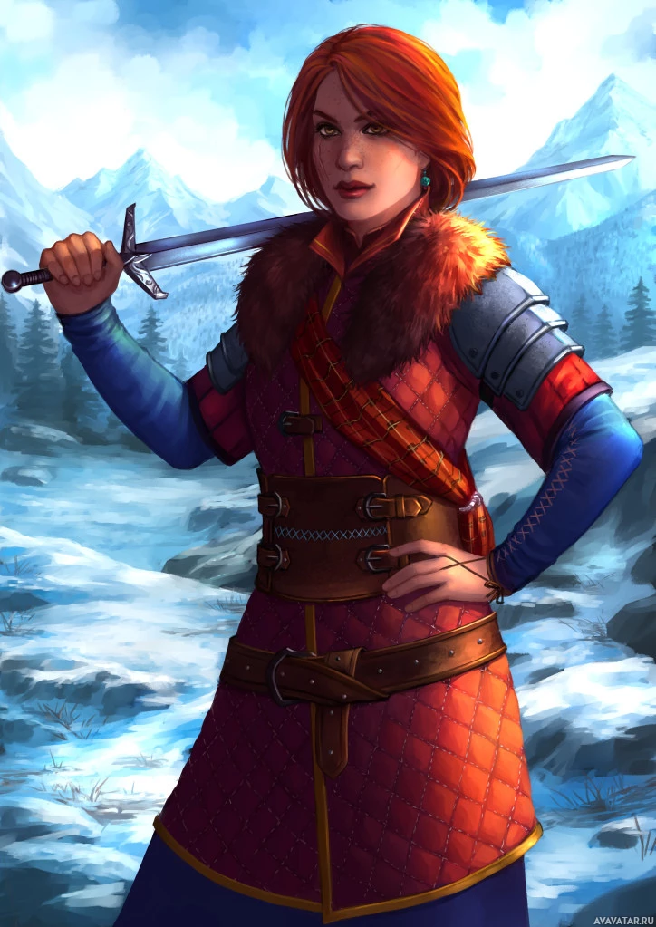 На картинке изображен персонаж из видеоигры «Ведьмак 3: Дикая Охота». Это Cerys a Craite, на что указывают ее отличительные рыжие волосы и доспехи. Она держит меч и, кажется, находится в заснеженной среде, типичной для обстановки игры.