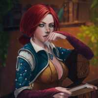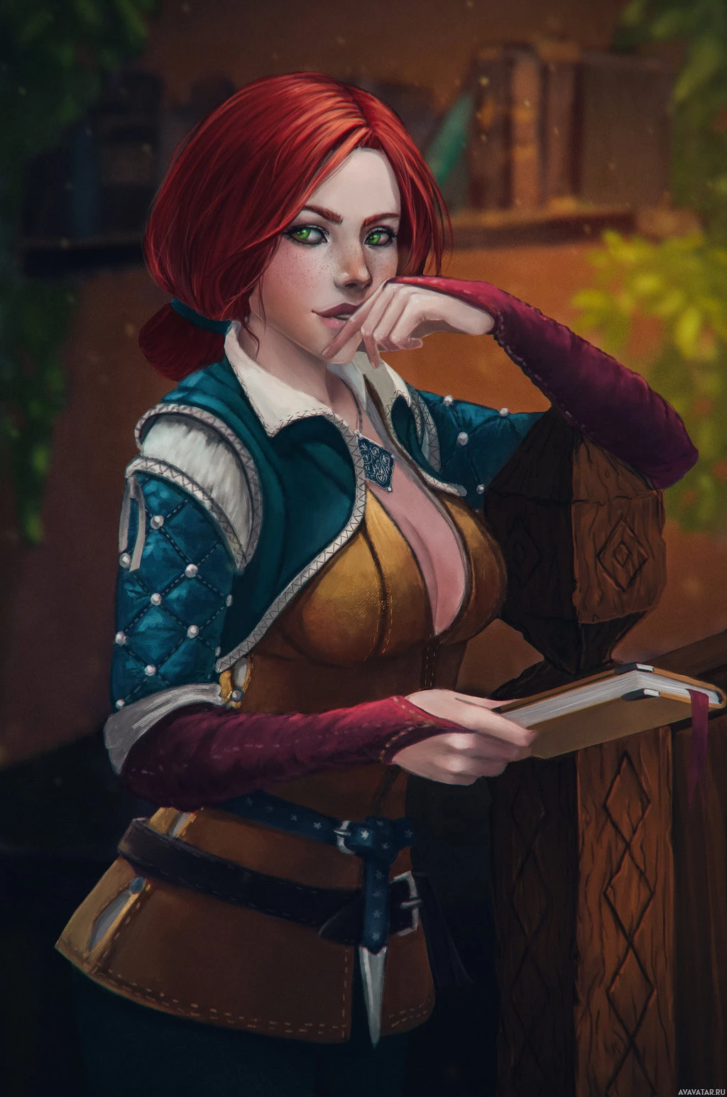 the video game "The Witcher 3: Wild Hunt." She is depicted as a human witch and appears to be in a contemplative or thoughtful pose. She has