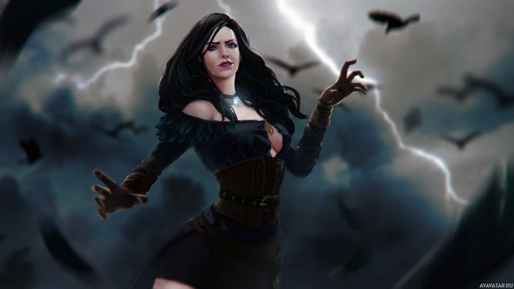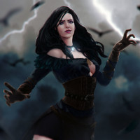 Wild Hunt," specifically portraying Yennefer, a sorceress known for her powerful magic and intricate tattoos. She is standing with one hand raised towards