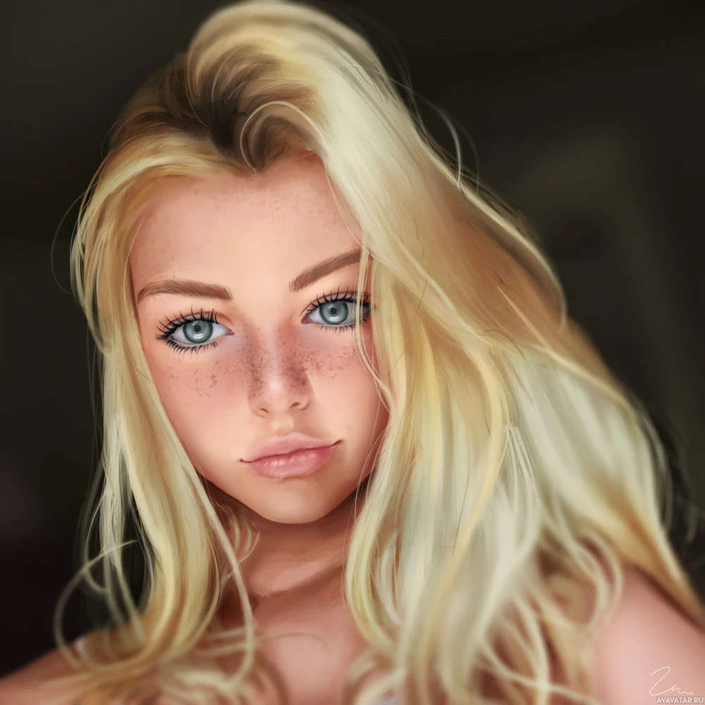 a young woman with blonde hair. She has prominent freckles across her nose and cheeks, which gives her