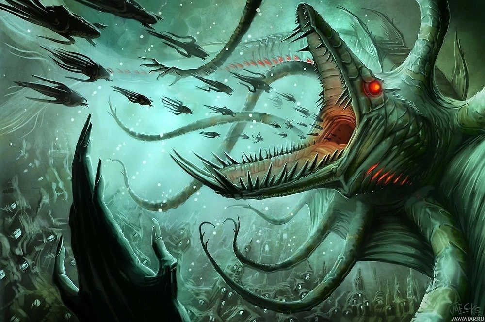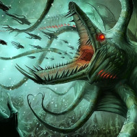 dark environment surrounding it, which appears to be underwater or in some form of subterranean abyss. The color palette is dominated by shades of green, blue, and black, contributing to the overall