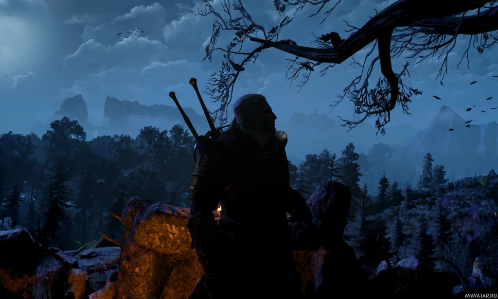 Geralt of Rivia standing on rocky terrain at what seems to be dawn or dusk, given the soft lighting. The environment is forested and rugged, with dark silhouettes of