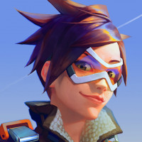 The image shows an animated character, Tracer from the video game "Overwatch." She is a hero with abilities that allow her to manipulate time. This character has distinct features such as a white and orange suit, goggles on her head, and a cheerful expression.
