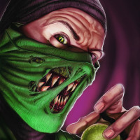 green skin and unique appearance that includes an elongated face with glowing eyes, a large mouth, and a scaly texture on his body. He's holding an object in his hand, which appears to be a fruit or some kind of plant. The character is wearing a bandana over his mouth and nose, which might suggest he has a respiratory condition that requires him to breathe through the bandana. The background is dark and moody, fitting for the Mortal