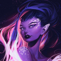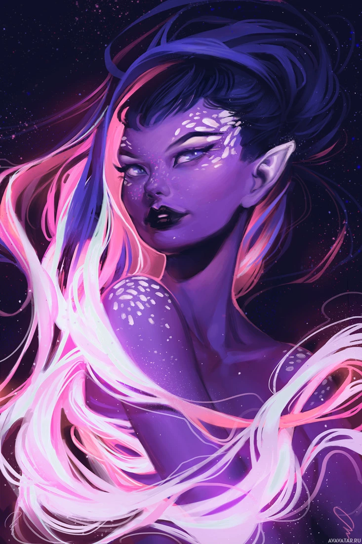 night sky, enhancing the mystical atmosphere. The character's outfit and accessories, such as the earrings and the headband, add to the fantasy aesthetic. Overall, the image conveys a sense of otherworldly beauty and magic typically found in fantasy artwork.