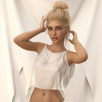 blonde hair styled into an updo, and she's wearing a sleeveless top with a draped design that reveals her midriff. Her pose is one of elegance and confidence, with one hand placed on her head while the other rests by her side. The character is standing against