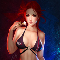 a black bikini and holding an item that resembles a flower, possibly as part of her attire or decoration. In the background, there's a blurred graphic that could be related to gaming or pop culture, suggesting she might be from