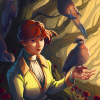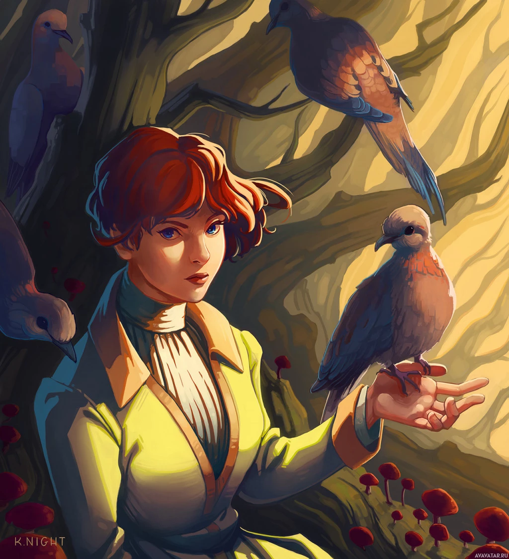 red hair, dressed in what appears to be a vintage-style outfit. She is holding a bird on her hand, and there are