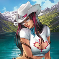 a cowboy hat, glasses, and a top that has a maple leaf design, which might suggest a Canadian theme or influence. She also seems to have tattoos on her arms. She is holding a rope in one hand, possibly indicating