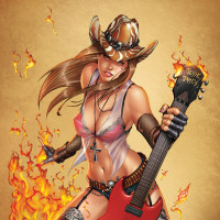 The image features an illustrated character, a female with long hair, wearing a cowboy hat and a tank top. She is holding an electric guitar that appears to be on fire. Flames are surrounding her, suggesting she might be playing a fiery tune or performing in front of a burning backdrop.