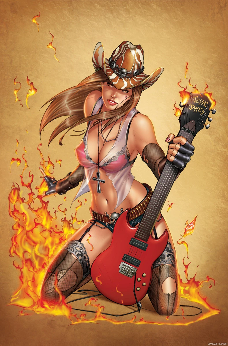На картинке изображен иллюстрированный персонаж, женщина с длинными волосами, в ковбойской шляпе и топе танка. Она держит электрогитару, которая, кажется, горит. Пламя окружает ее, предполагая, что она может играть огненную мелодию или выступать перед горящим фоном.