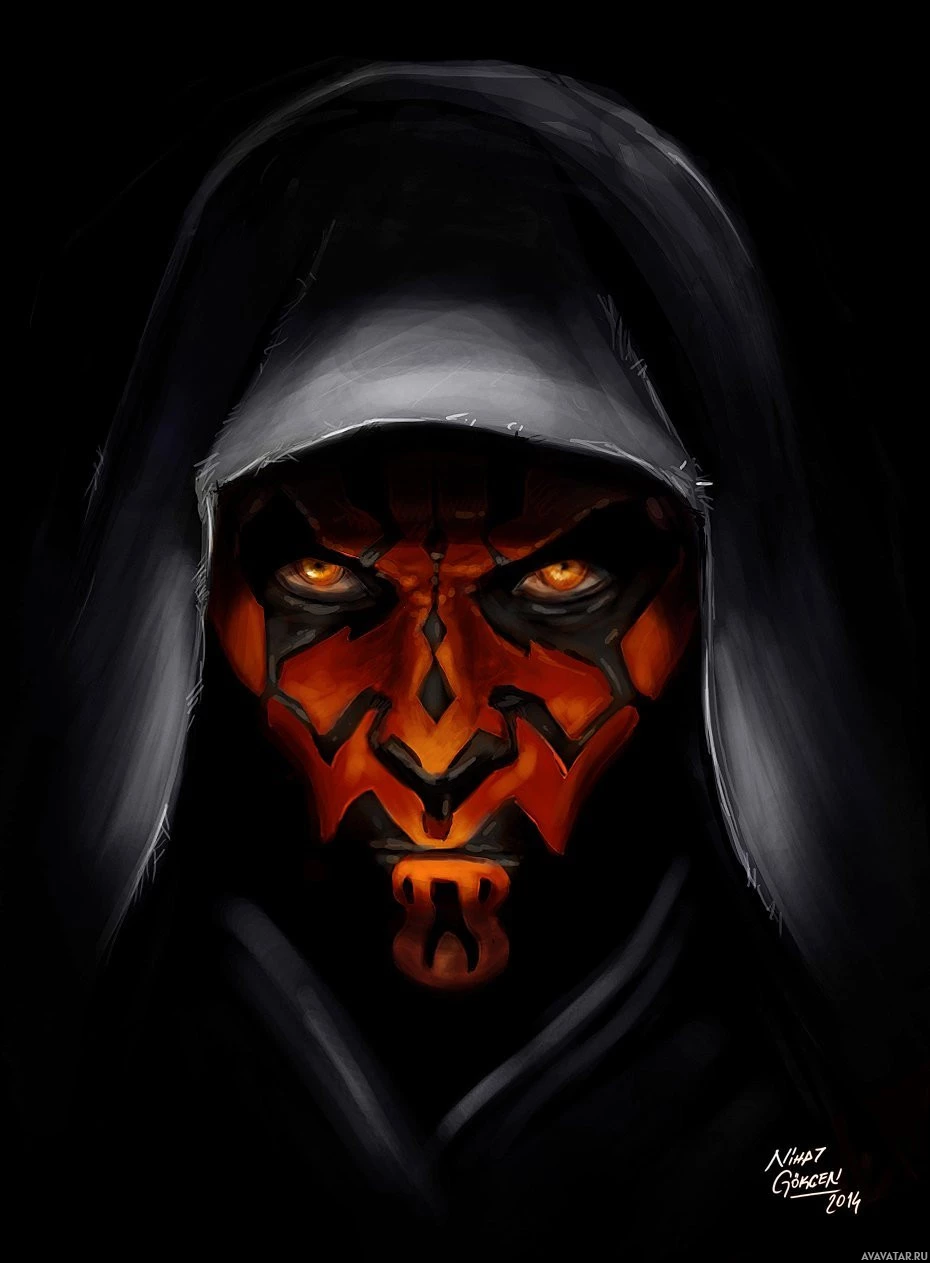 На картинке изображен персонаж, известный как Дарт Мол из франшизы «Звездные войны». Он изображен с его лицом, окрашенным в красный цвет, с отличительными отметинами, которые характерны для его внешности. Мол показан в плаще с капюшоном и имеет угрожающее выражение на лице.