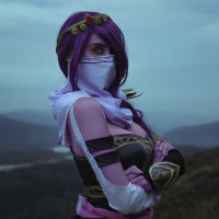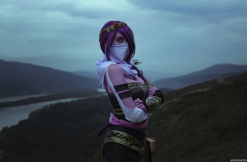 cosplay attire inspired by a character from Dota 2. The costume includes elements such as armor and a helmet that resemble the game's Templar Assassin