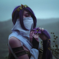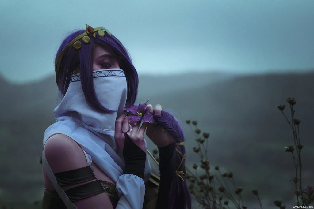 purple hair and is wearing a costume that includes a white cloak and what appears to be a mask or gear with a visor over their eyes. They are holding what seems to be a flower in one hand, which could symbolize