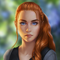 a female character with red hair, wearing what appears to be medieval or fantasy-style clothing. She has a thoughtful expression and is set against a background that looks like
