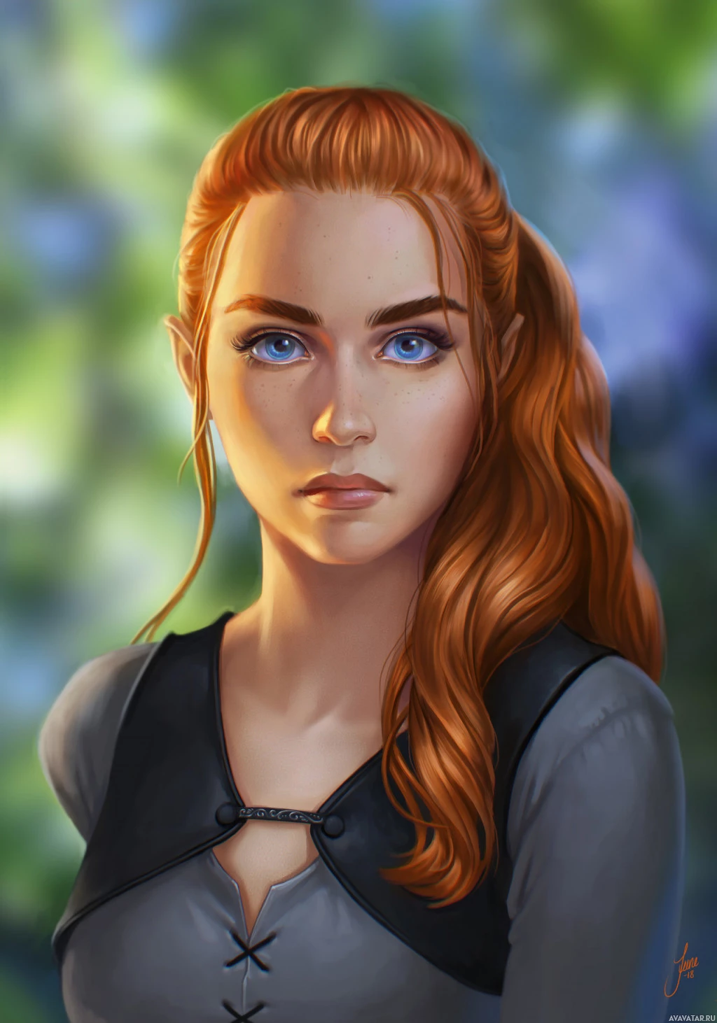 a forest scene with greenery around her. There's also some text at the top left corner, but it doesn't provide any additional context about the image itself.
