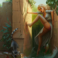 a serene moment between the girl and her lemur companion in a natural, possibly historical environment.