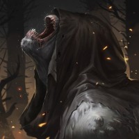 a fantasy character that appears to be a monster with a hood. This creature is shown in what seems to be an intense or possibly aggressive posture, as it has its mouth open and eyes closed, which might suggest screaming or howling. The background suggests a dark, possibly