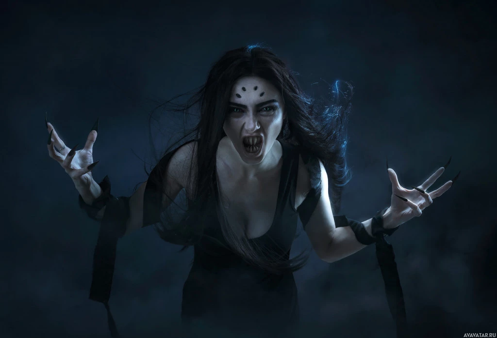 dark hair and appears to be wearing some sort of costume or outfit that could suggest a character related to horror or the supernatural, possibly vampire-themed given the context provided. The background is ominous with