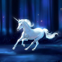 The image depicts a unicorn walking through a dark, enchanted forest at night. It is a fantasy-themed illustration with a magical atmosphere created by the twinkling stars and the illumination of mysterious lights that add to the ethereal quality of the scene.
