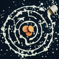 The image shows a circular pattern created with white frosting or cream on a dark surface, resembling a target. In the center of this pattern are two biscuits or cookies. There's also a cup that appears to have spilled some kind of liquid onto the surface. The setting suggests a playful and possibly whimsical presentation of the biscuits.