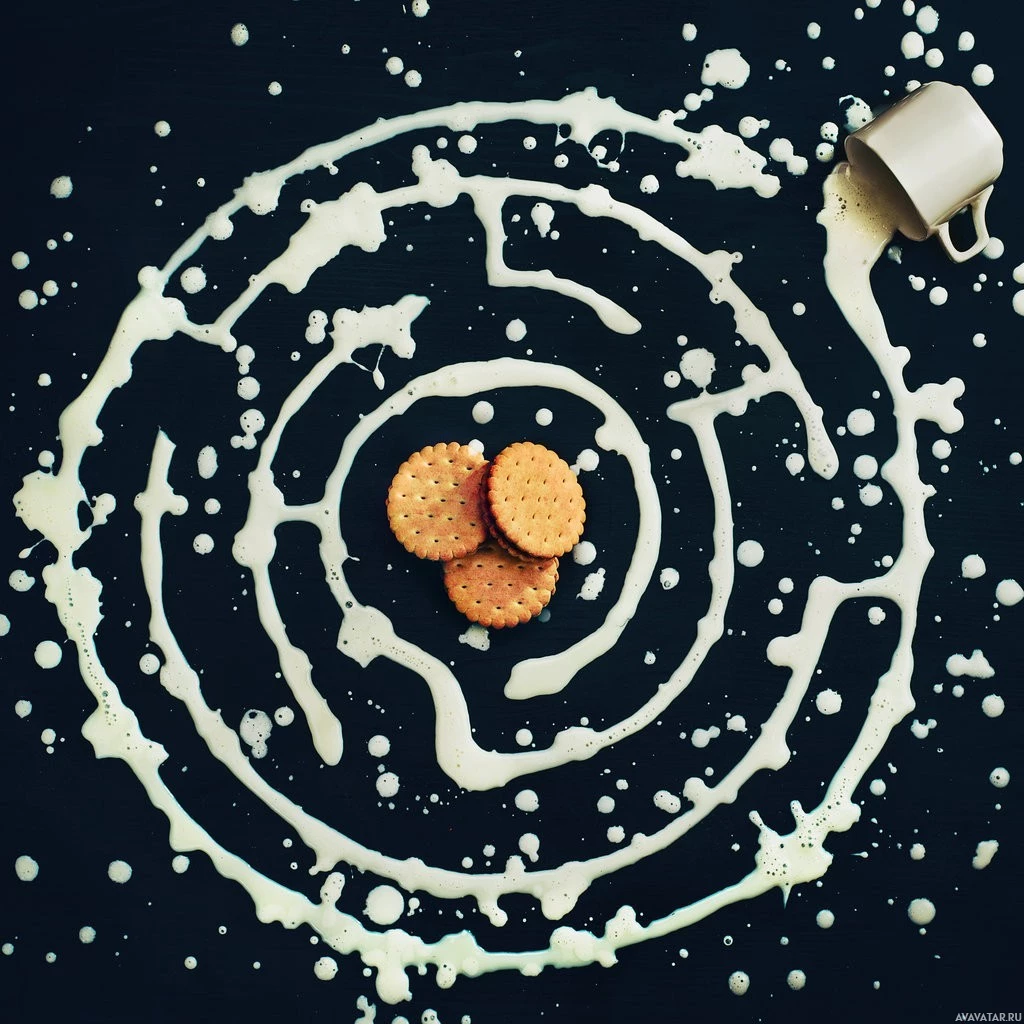 На картинке показан круговой узор, созданный с белой морозилкой или кремом на темной поверхности, напоминающей мишень. В центре этого рисунка находятся два печенья или печенья. Есть также чашка, которая, кажется, пролила какую-то жидкость на поверхность. Настройка предполагает игривое и, возможно, причудливое представление печенья.