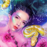 yellow snake is coiled around her neck and shoulders, adding an unusual and intriguing element to the scene. The color palette of the image is vibrant, with shades of green, blue, and pink that give it a dreamlike or artistic feel. The overall impression is one of serenity mixed with