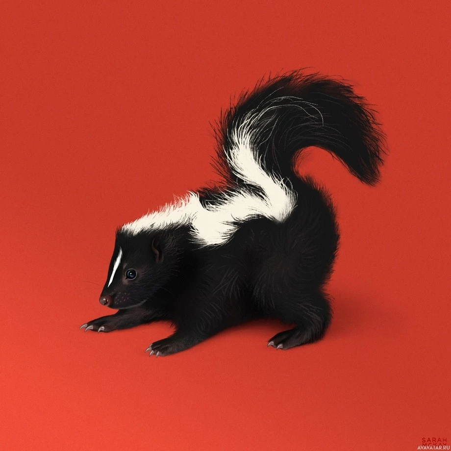 a dynamic pose, as if it's in mid-movement or stretching its muscles. The background is solid red, which contrasts sharply with the darker tones of the skunk, making the image visually striking.