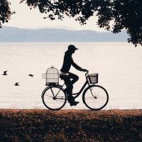 a body of water. The cyclist is wearing a helmet and appears to be carrying something in the front basket of the bike. The