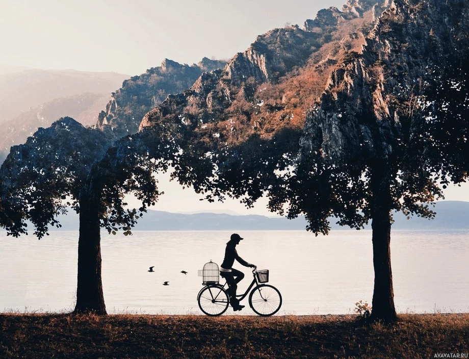 setting sun creates a silhouette effect for both the cyclist and the trees behind them, adding a serene and picturesque quality to the scene.