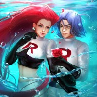 blue hair and is dressed in a white outfit with red and blue accents, also featuring the name "Jessie." They appear to be looking at each other while surrounded by