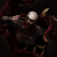 hollow sockets, adding to the horror effect of its appearance. The character is holding onto what appears to be an oversized tongue or some kind of dark tendril-like appendage that wraps around its arm and stretches out from its mouth. The overall atmosphere of the image suggests a theme related to horror and the supernatural.