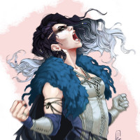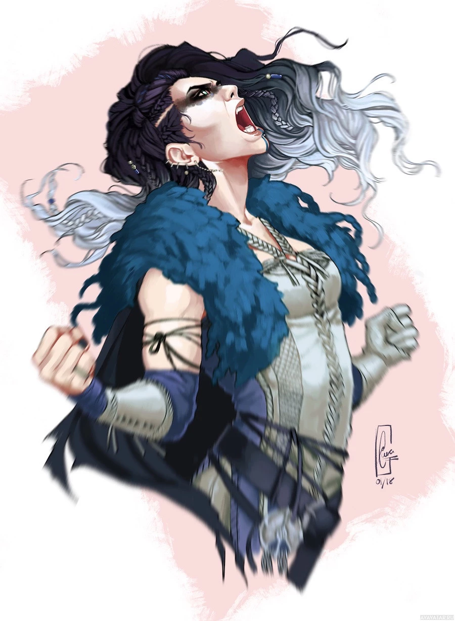 silver hair and is wearing what appears to be a fur or feathered cape, suggesting she might have some kind of magical or supernatural ability. Her expression suggests intensity or excitement as she yells or cheers. The character is depicted with
