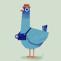 The image shows a stylized illustration of a pigeon. It is wearing a camera around its neck, capturing the scene in front of it with the lens pointed forward. The background is plain and does not distract from the central