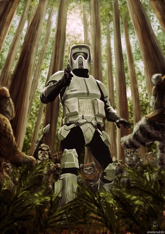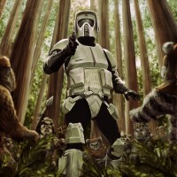 the Star Wars franchise. At the center is a character dressed in a stormtrooper uniform, which is commonly associated with the Empire in the movies. Behind this figure are several ewoks, which are