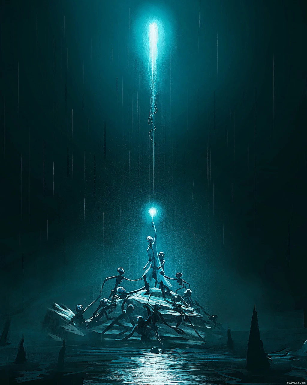 a group of figures huddled together in what appears to be a dystopian or post-apocalyptic setting. There is a person standing on a rock amidst a dark and