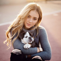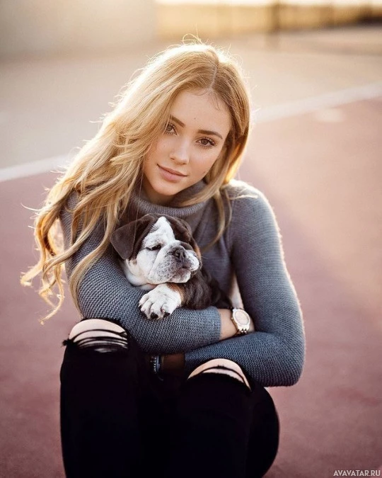 a young woman with blonde hair sitting on the ground. She is wearing a gray sweater and has her arms wrapped around a dog, which appears to be a bulldog based on its distinctive features such as a muscular body,