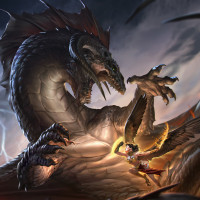 a fantasy scene featuring a dragon. The dragon is large, with wings and a serpent-like body, and it appears to be in the midst of