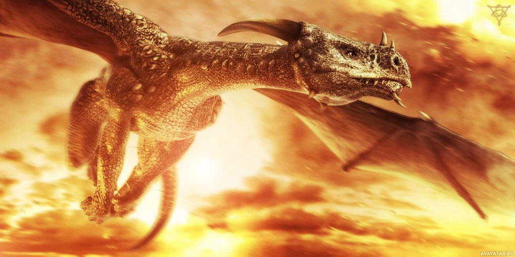 a creature of myth or a work of fiction. In the background, there are flames and clouds, which contribute to the dramatic and intense atmosphere typically associated with such fantasy elements.