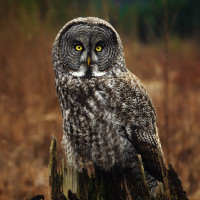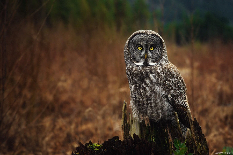 На картинке изображена большая рогатая сова, расположенная на том, что кажется постом или ветвью. Это крупный план совы, с ее отличительными ушными пучками и ярко-желтыми глазами. Фон несколько размыт, но, кажется, показывает естественную обстановку, вероятно, в дикой природе.