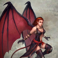 large bat-like wings and is wearing an outfit that appears to be inspired by fantasy or demonic motifs. Her pose and expression suggest she may be in motion or preparing for action. The background has a textured appearance, adding depth to the image.