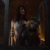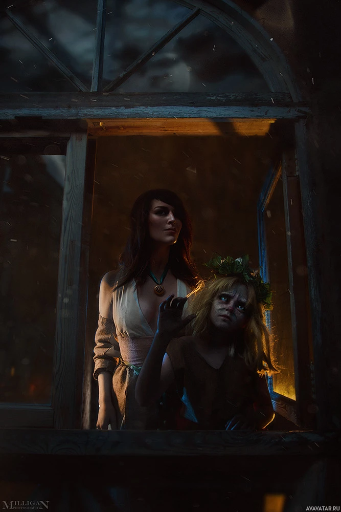 Geralt of Rivia, and on the right is a child with a crown of flowers or possibly a wreath on their head, suggesting they might be portraying a young version of Jaskier or another similar character from the series. They are both looking out through