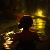 light source. It is taken from behind the individual, who appears to be relaxing or possibly swimming. The silhouette of the person and the surrounding environment suggest it could be a scene from
